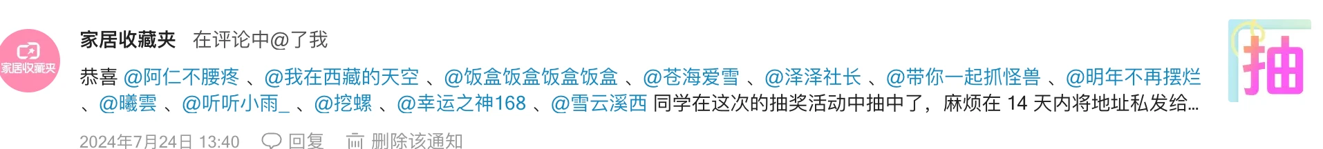 然后那个up就没办法,只能重新抽了,我们这些中奖的不管下次是否中奖,都补偿100元,很显然重抽没抽到我,不过还有还有100元,这事说倒霉但是还有点幸运哈哈哈【重抽他也提取不出来转发并关注的,于是最后从评论列表里抽的】