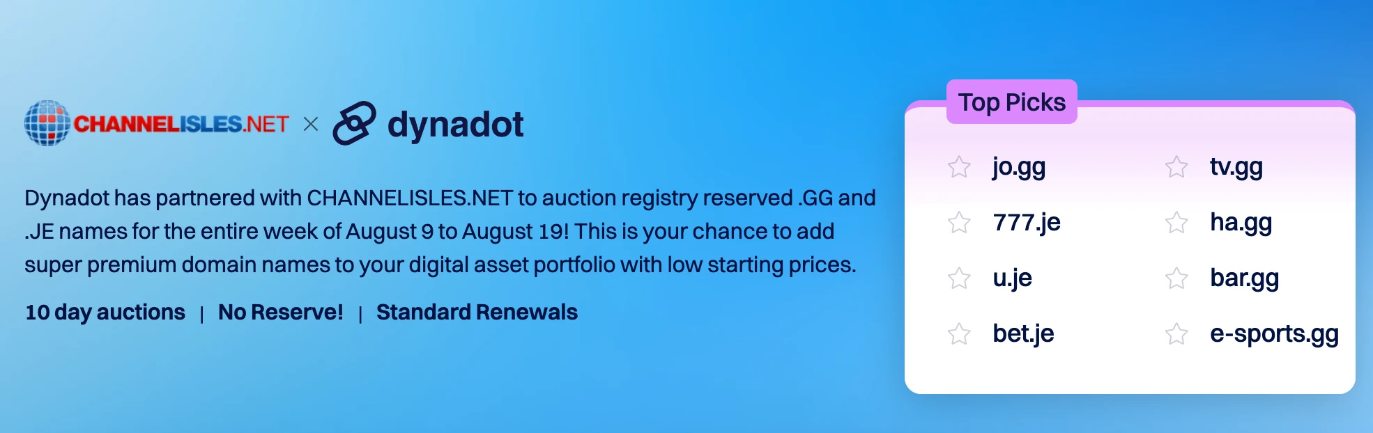 好消息,Dynadot 再次与 CHANNELISLES.NET 合作拍卖 .GG 和 .JE 保留域名,拍卖日期为 8 月 10 日至 8 月 20 日,部分域名起拍价低至注册价格59美元,标准续订价格,无保留价!请通过拍卖页面提前查看 tv.gg,dd.gg,777.je 等精彩域名。