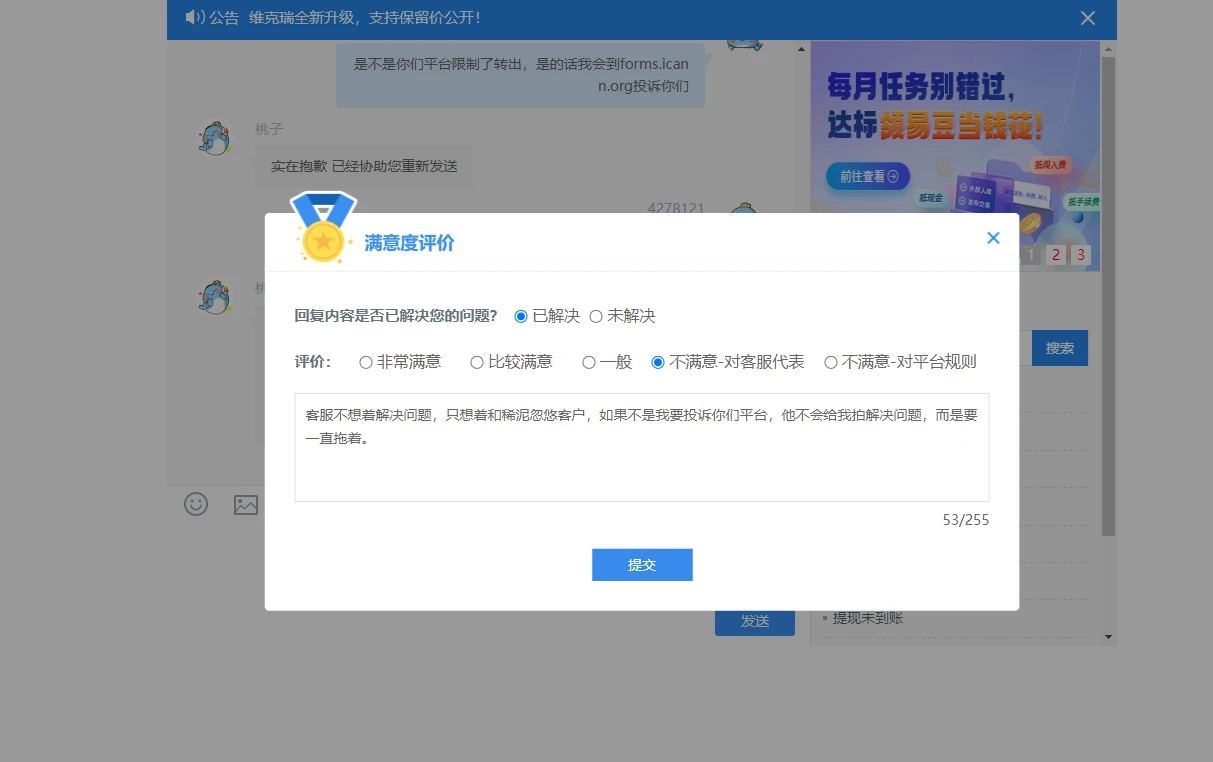 易名网客服纯忽悠,我要投诉平台他立马解决问题