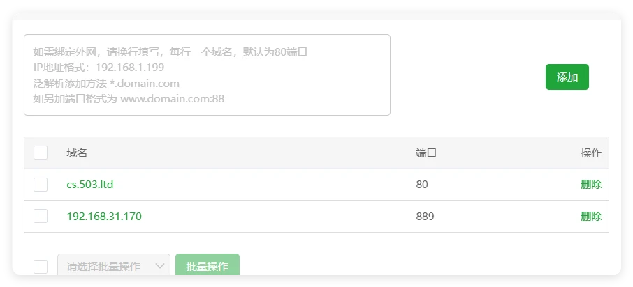建站,没啥好讲解的,就跟普通服务器一样,但是 要在域名中加上个 ip+端口 例如我的小主机内网IP是 192.168.31.170 端口是 889  就在这里填 192.168.31.170:889 ,因为前面已经配置了动态解析。所以你在外网输入 你的域名:889 (例如http://a.naigou.cn:889就会指向你的内网192.168.31.170:889