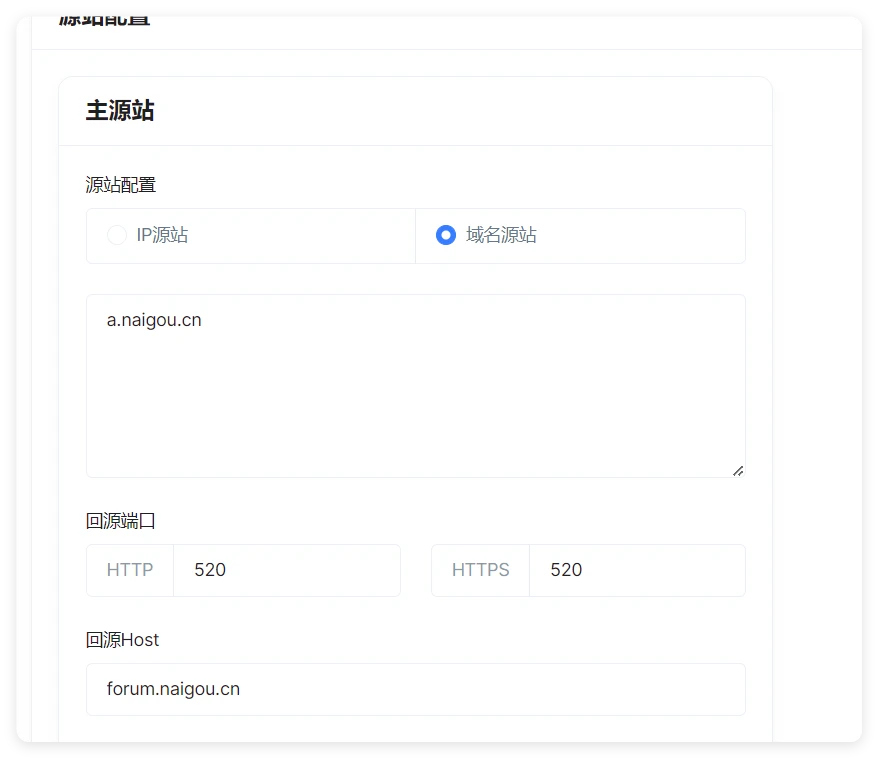 添加自己的域名进去 并设置源站  域名就是你的域名 端口就是你设置的端口