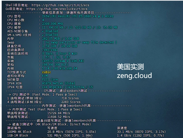 以下测试机器为泽云的美国高防9929 4 核 4G,E5 2680 v4,宽带 20M: