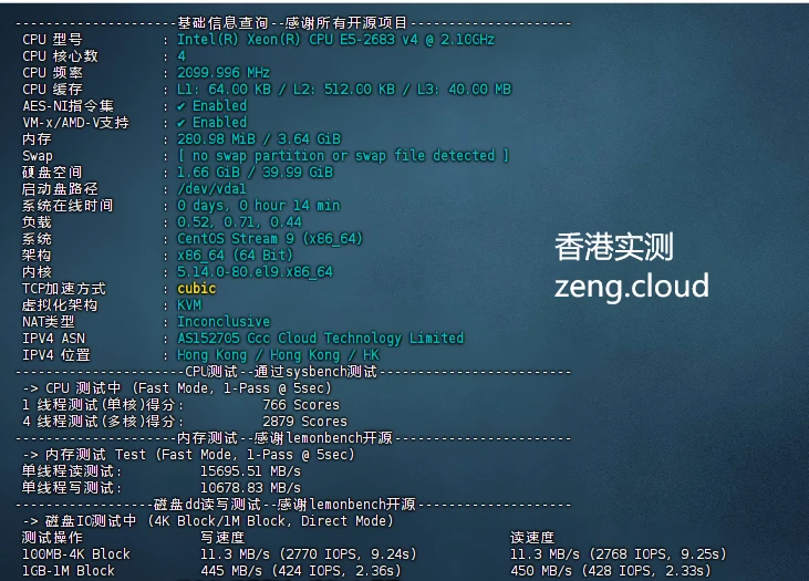 以下测试机器为泽云的香港 4 核 4G,E5 2683 v4,宽带 7M:
