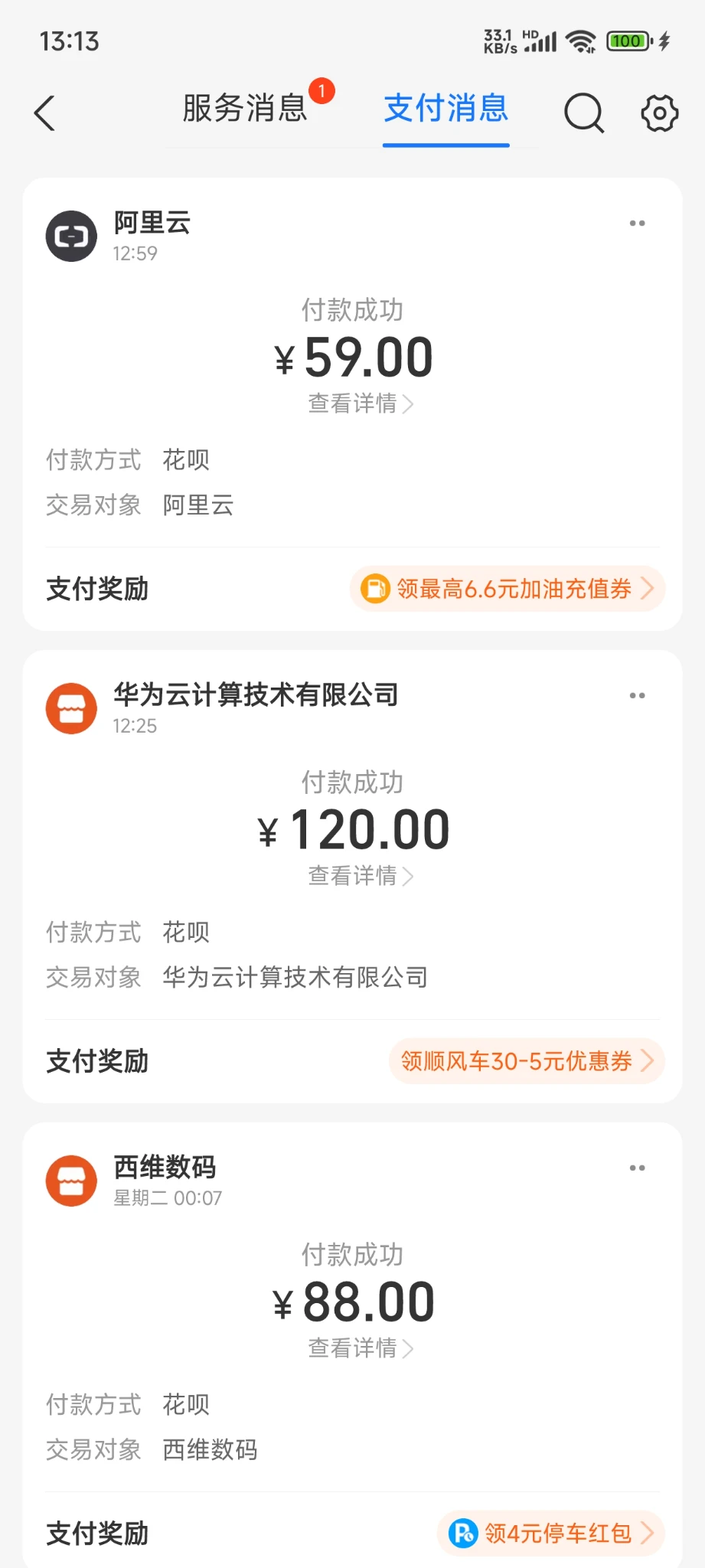 今天用花呗续费了3个米
