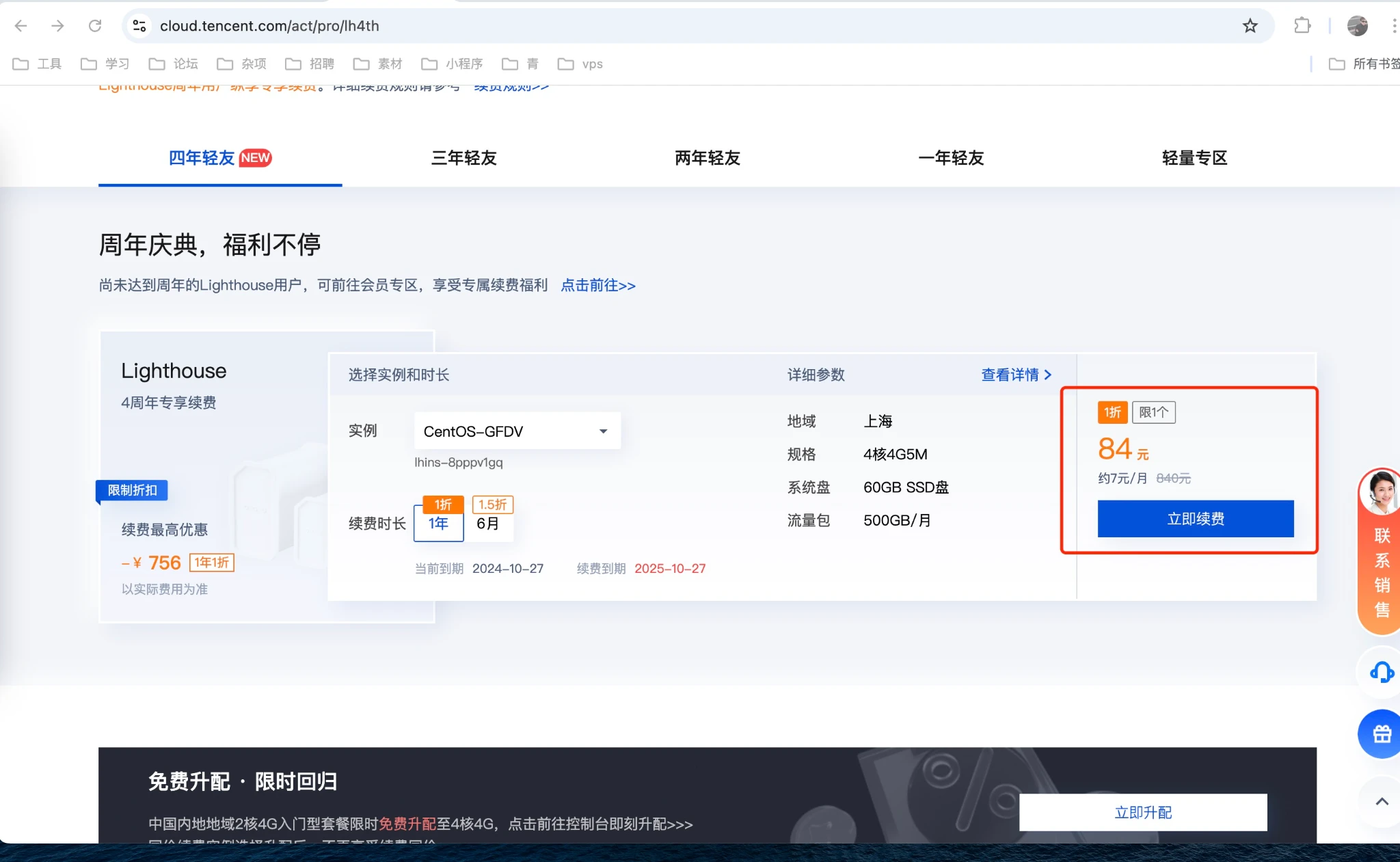 3.再然后去活动里就可以看到,84一年的4h4g续费。三年轻友126。
