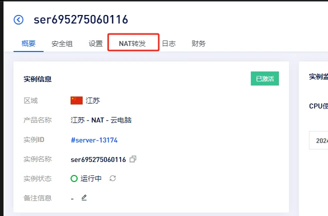 到这一步,接着返回刺激云服务器控制面板,找到NAT转发选项 如下图所示: