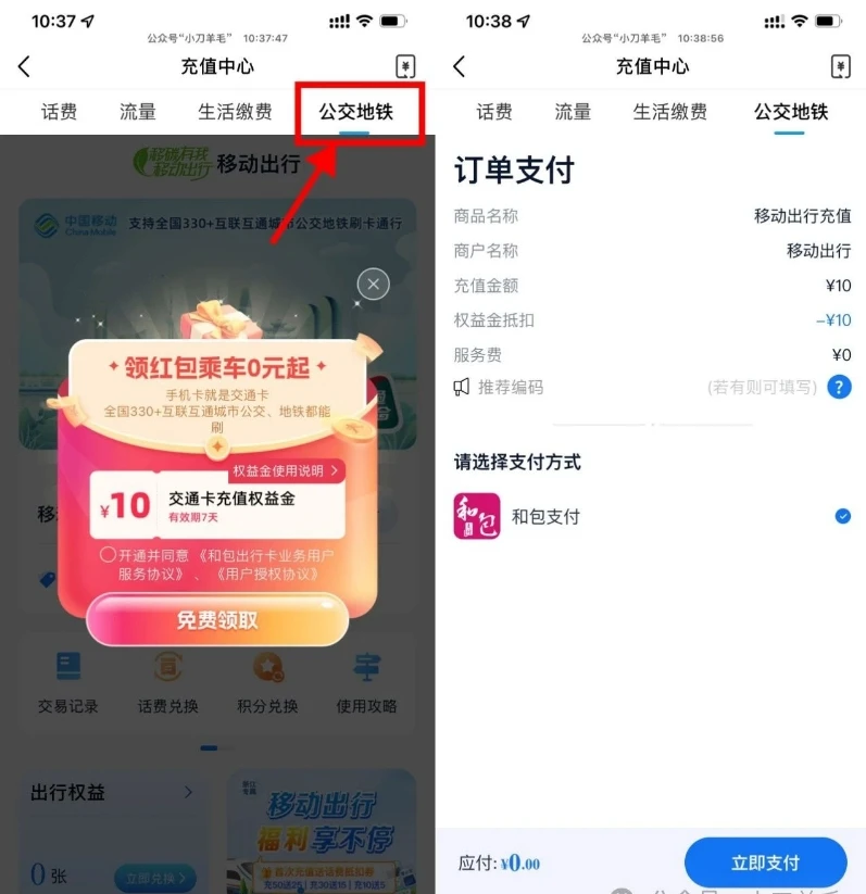 移动直接领10元公交地铁余额