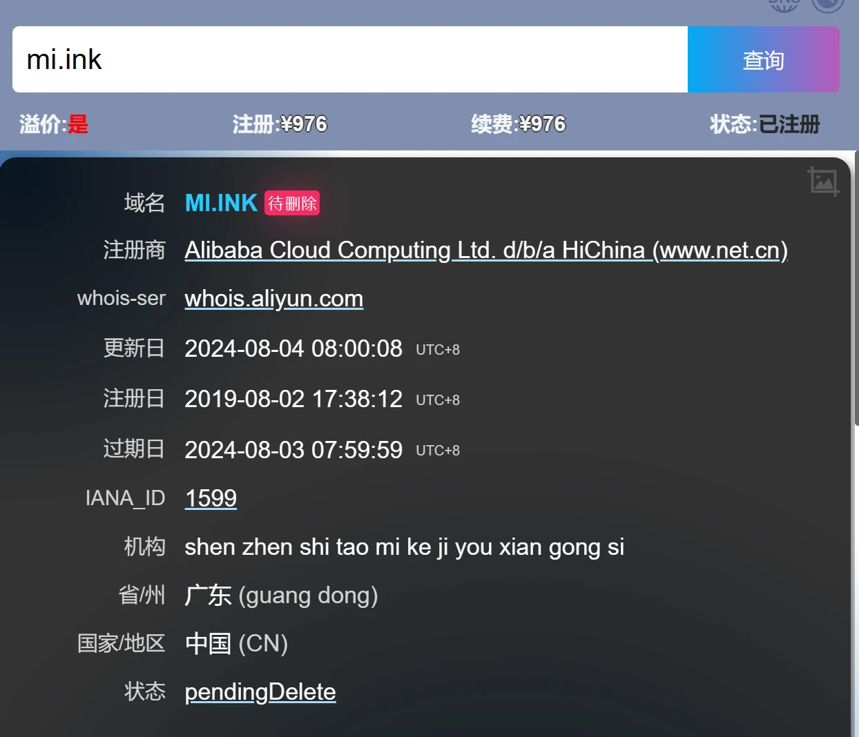 我刚刚关注到mi.ink进入待删除期了,查了一下,果不其然,溢价了,976元。