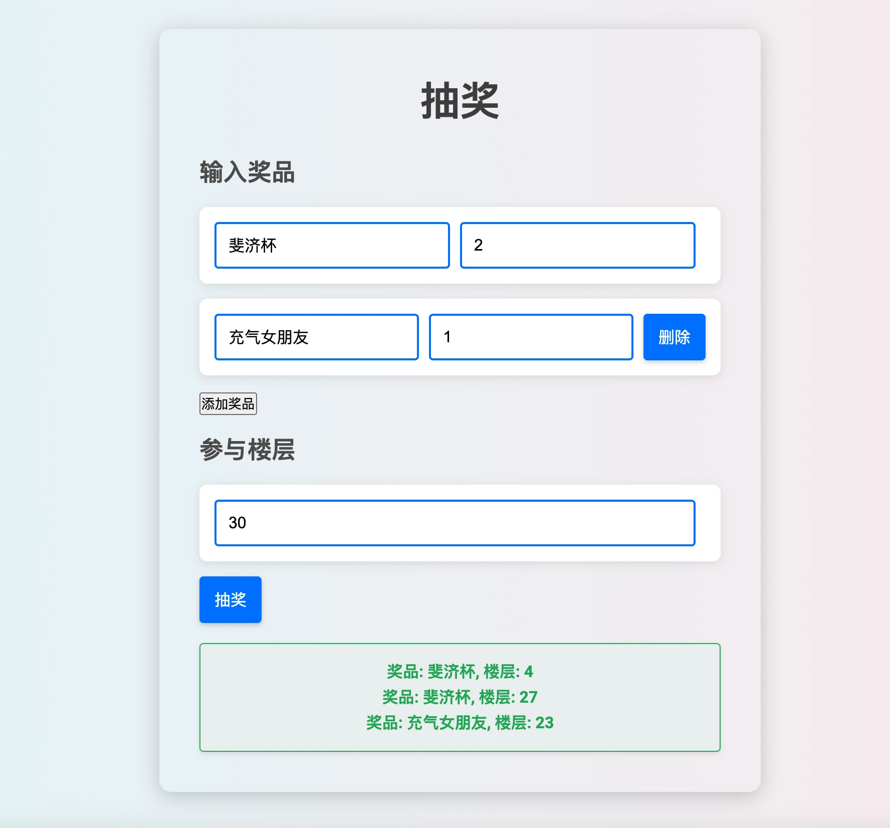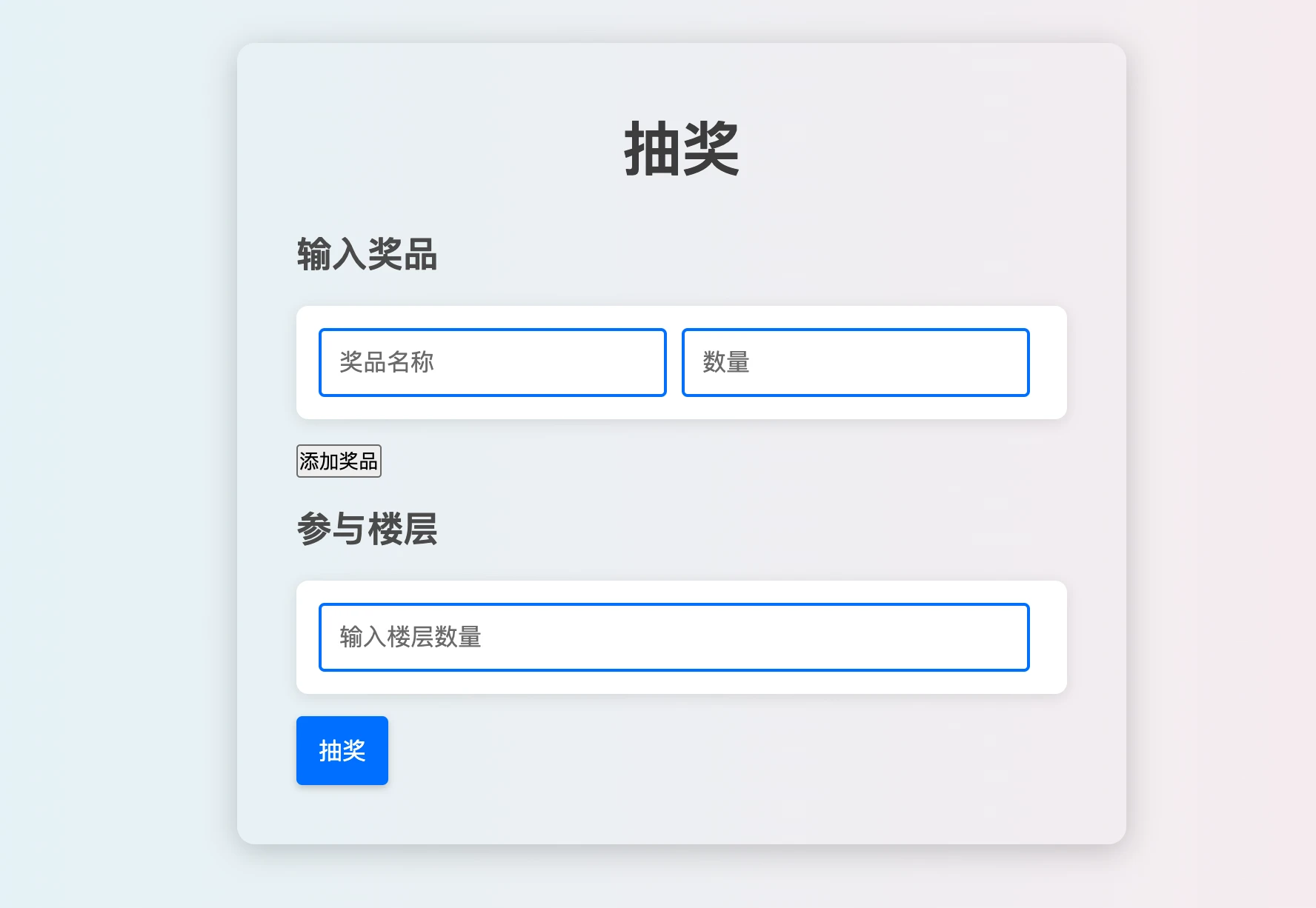 昨晚上抽奖插件异常,临时用ai写了一个抽奖源码,输入奖项信息和参与的总楼层数,然后随机从楼层中抽取。