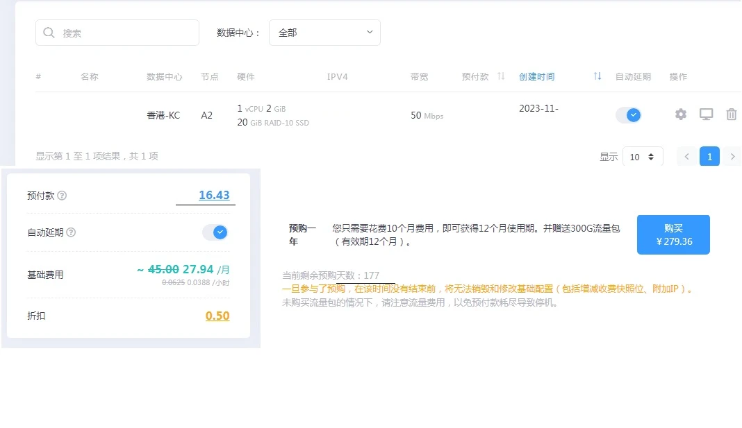 这个是dogyun hk 弹性云,25/04月后,弹性云可以自由更改配置的,我这个买了1H2G,我的网站访问量不大,就放了2个米表,一个博客,一个论坛,速度还可以 比MG快多了,年续费280块,狗云一贯是稳定的
