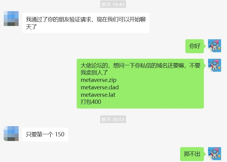 然后昨天发了打包metaverse的3个域名的帖子,另外一个大佬私信我想要,于是我们加上了好友。但他只要一个,开价150,我拒绝了,因为我是打包出,不打算单出。于是没了下文。