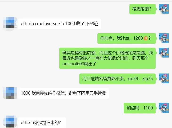 于是我又去问了昨天那位坛友,有没有想法。他对eth.xin有想法,但是只出200,我说加个0,他觉得贵了。于是后面他又提出eth.xin加另一个域名,打包1000。我觉得低了,毕竟这个前缀,就目前而言,时长没有低于5位数的,我这已经算是一个捡漏价了。