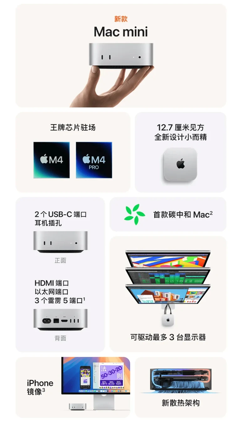 新款 Mac mini 起售价为 4499 元,教育优惠价为 3749 元。标配 16GB 内存,即日起接受预订,11 月 8 日正式发售。