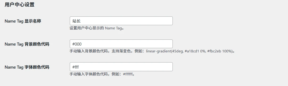 如题 仅适配子比,支持渐变色代码和hex颜色代码,只是第一版,后面再更新,目前只搞在了用户中心里,设置用户tag是在WordPress的后台-用户,点编辑往下翻 就能看到。