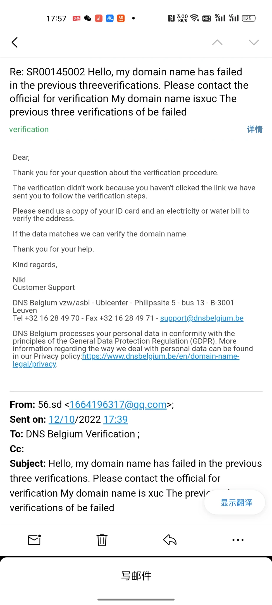 今年7月份注册了个.be 一直也没管昨天一看必须得注册局通过才可以解析 于是我给注册局发送信息 注册局给我说要我提供身份证和水电费证明 太操蛋了这后缀