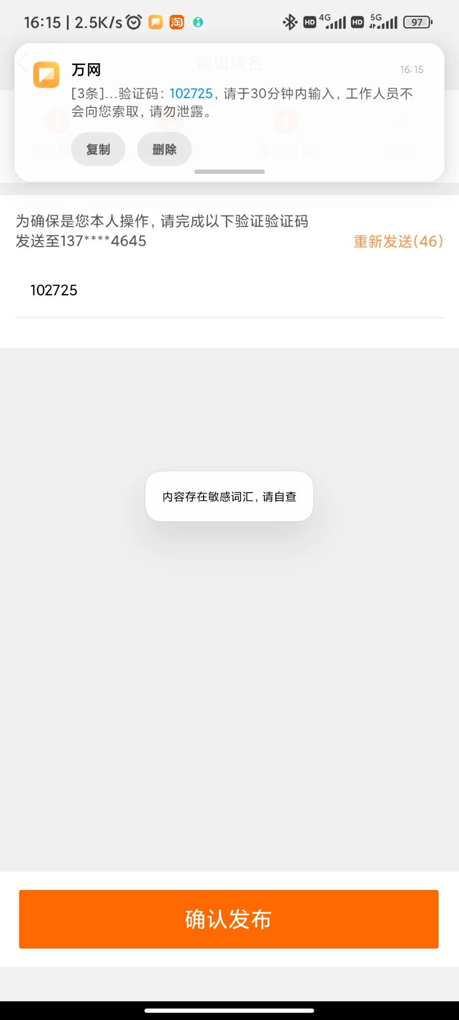 我也是看我出售中的域名发现的,点进去发现是下架状态,难怪没交易,重新上架果然提示敏感词,修改后就又卖出去一个域名。