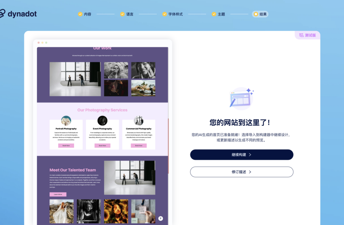 4、接下来您可以点击“继续构建”自由编辑您的网站内容,或是“修改描述”重新生成网站,直到您完全满意为止!