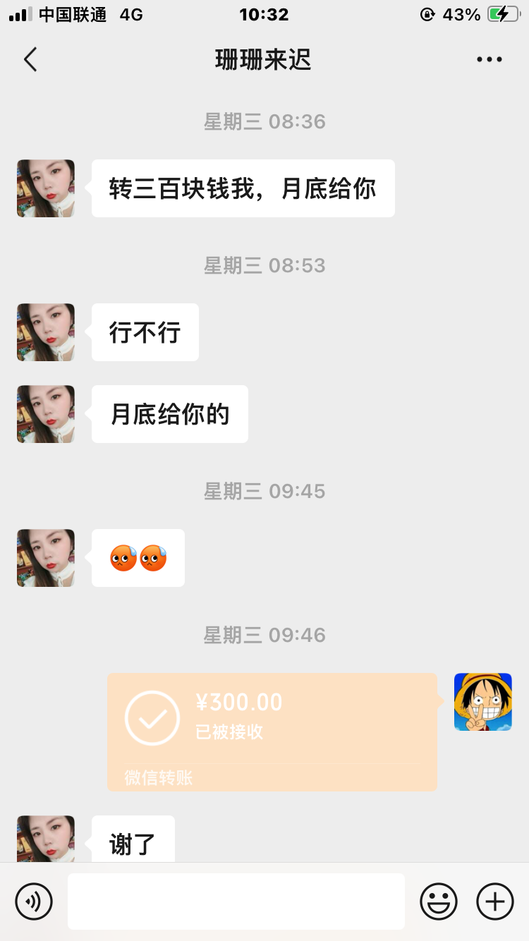 这个人从上星期三开始找我借钱,二话没说转了她300块,上午给的,晚上又问我要,一直到今天一直给我发消息,搞得我心里好不自在。其实我跟她一点都不熟,名字都不知道,只是一个镇子上的打过几次交道