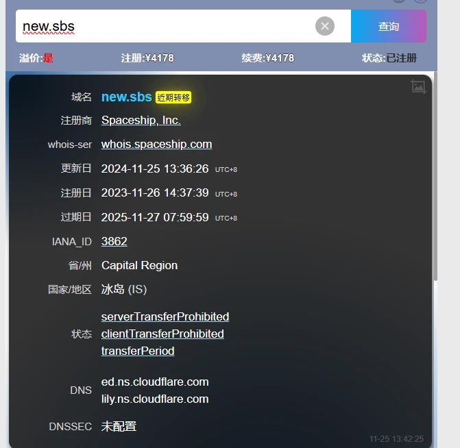 趁着new.sbs还有几天到期,本来在猪肉包续费好像10美金还是多少来着,看spaceship续费更便宜,就立马转移过去了,然后转移过去没多久,突然TMD价格变了,我还以为看错了,再去其他注册商也看了下价格都变成溢价了,只能说taniang.de这价格变得够快,从我转移刀价格溢价就前后10分钟不到。