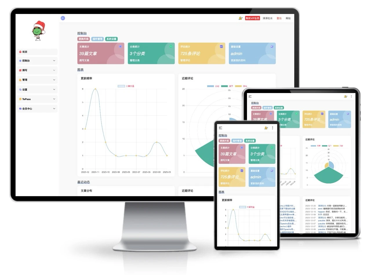 响应式设计,完美适配各种插件菜单显示,支持深色模式,后台首页还有图表显示,如下图所示