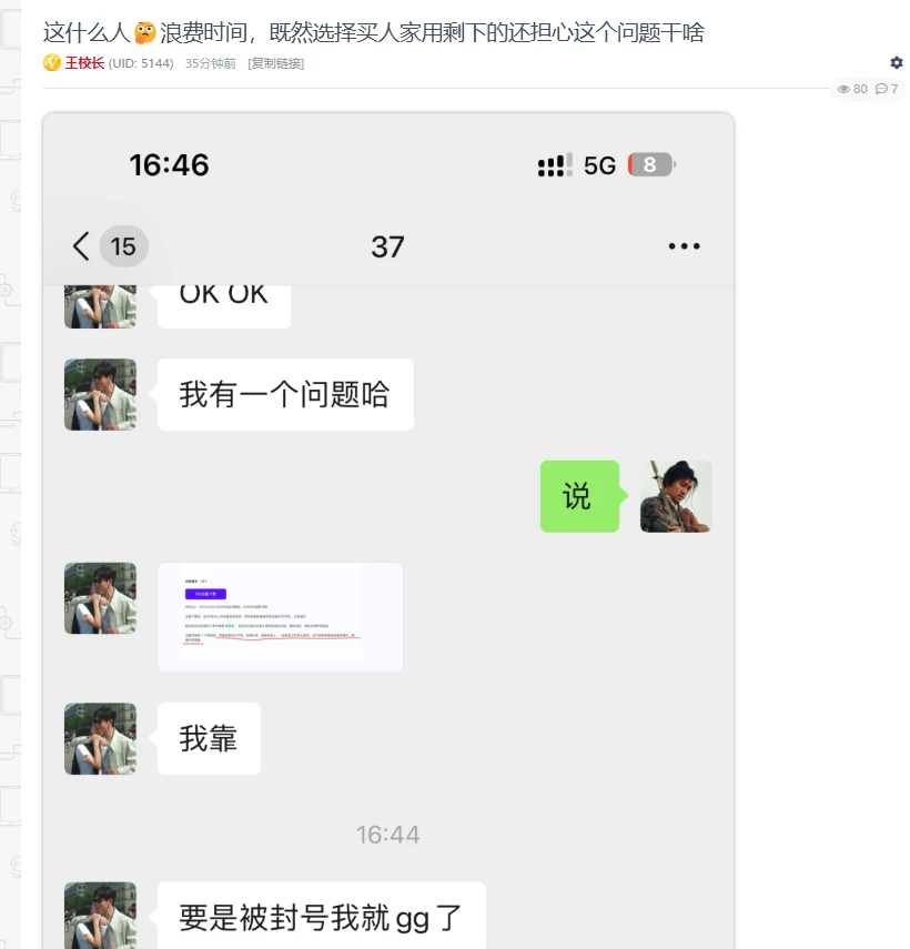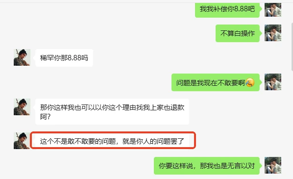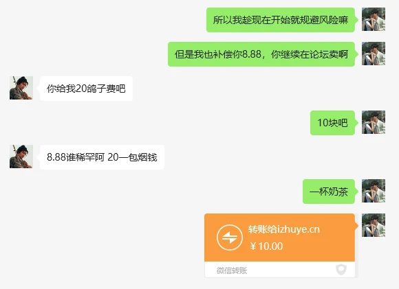 结论,他卖这个东西有明显的风险,我吃饱没事买回去等作者封号吗?想着都是玩论坛的,给个8.88辛苦亏,但是对方狮子大张口,要20,,,,,,,问题是他才卖100多,要20怎么敢的。我还是给了10块,够意思吧,而且也表达了歉意,对方直接在论坛挂我,聊天说我人有问题?我不想跟你这种人吵架,所以我懒得和你bb这么多,你挂我,我就澄清一下没别的意思,给各位坛友,增加乐趣!!!!