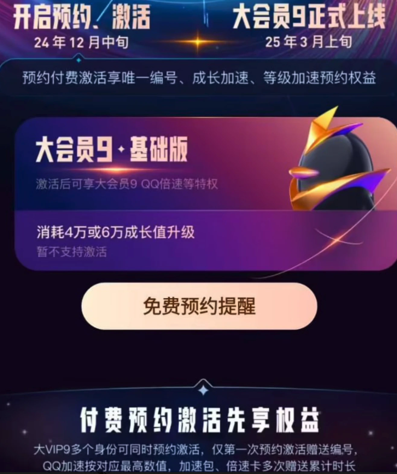 腾讯 QQ 日前开启大 VIP9(大会员 9)的预约,将于 2025 年 3 月上旬正式上线大 VIP9。