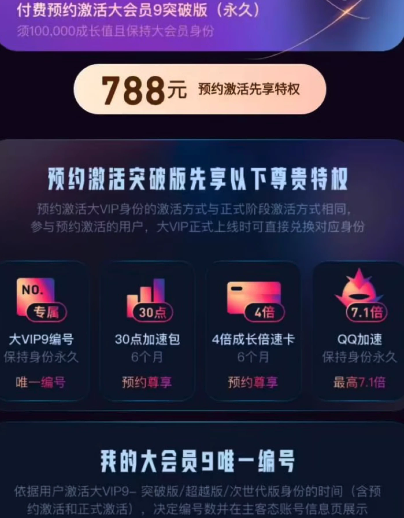 ● 突破版 788 元永久激活:拥有唯一编号、6 个月 30 点加速包、6 个月 4 倍成长倍速卡、7.1 倍 QQ 加速等