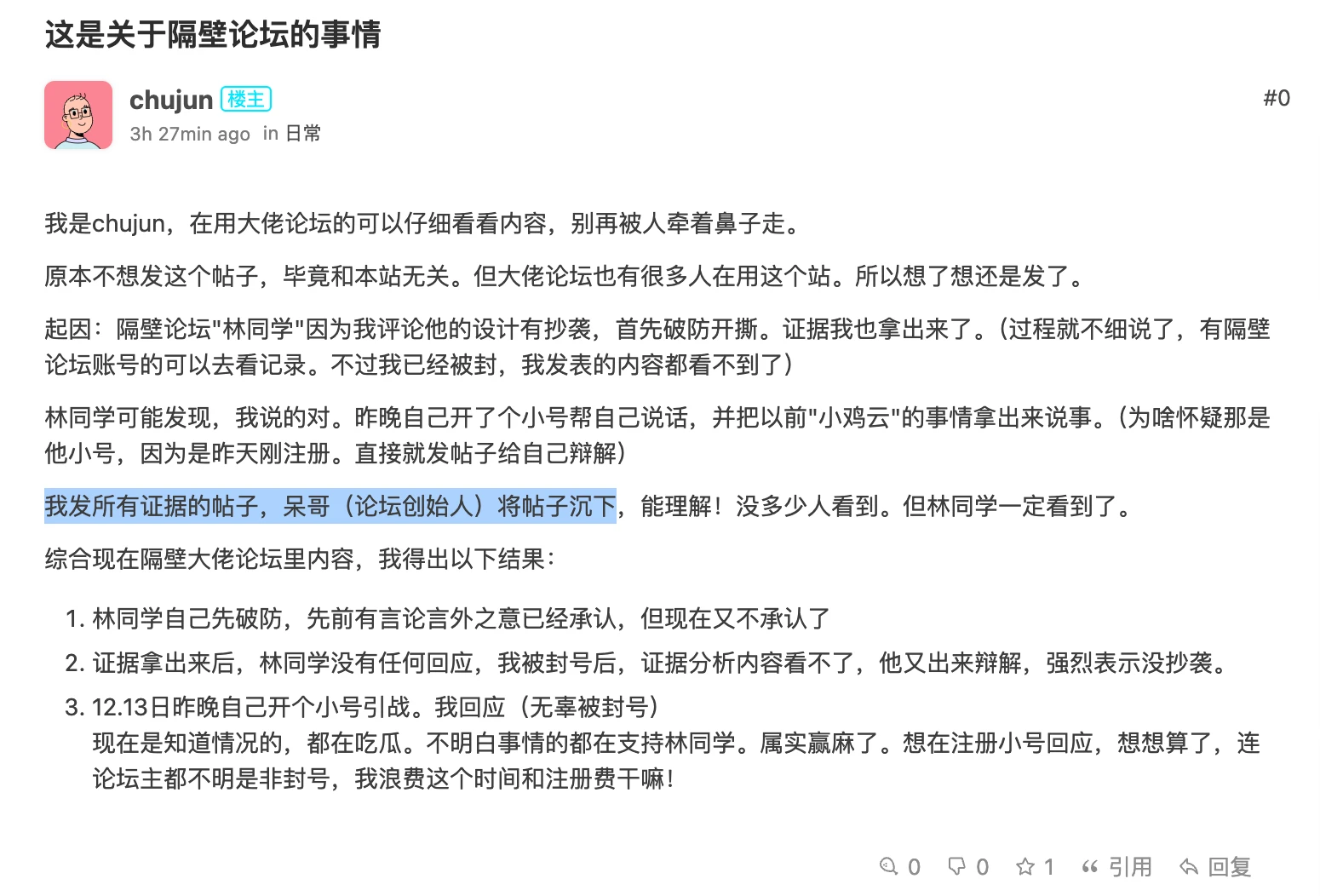 并对其双方争议帖都进行了下沉操作,但chujun认为站方仅下沉了他的帖子,隔壁帖子: