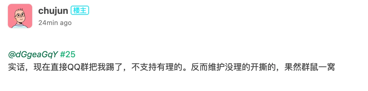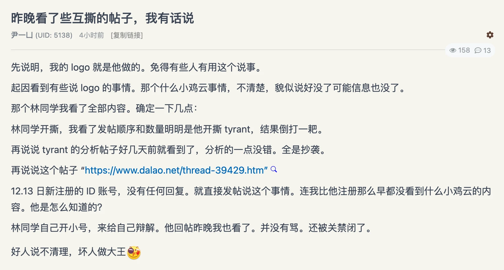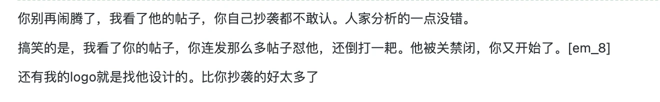 并前往了其它论坛发布“坛主不明是非封号”的内容,以及在论坛群聊中持续发布相关与"LOGO元素抄袭”内容,引起其他群员不满,在警告无果后管理员将其移出群聊。