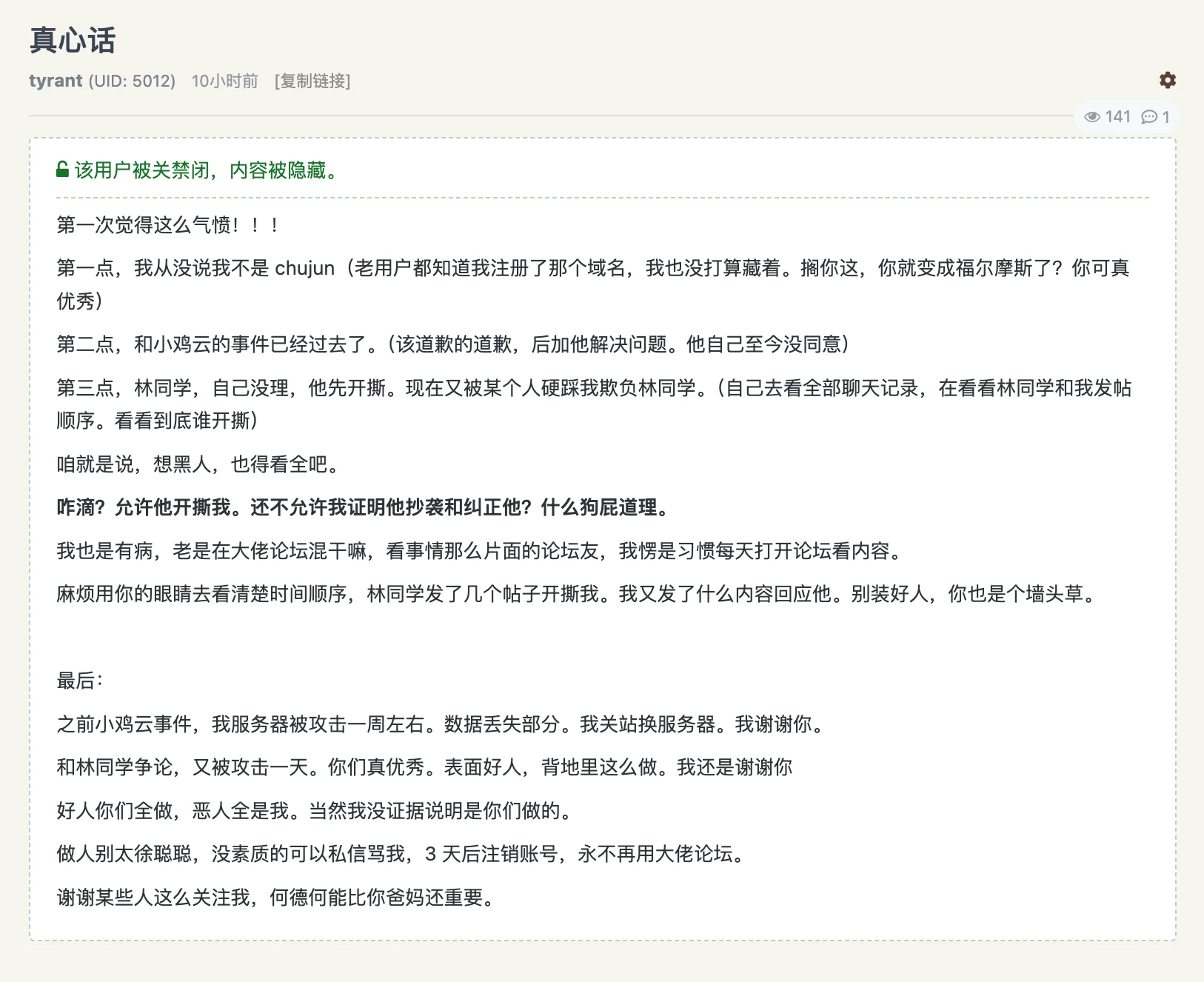 后因论坛用户站队小鸡云,chujun开始言论过激,让相关讨论帖子变得乌烟瘴气,遂相关帖子被站方下沉操作。