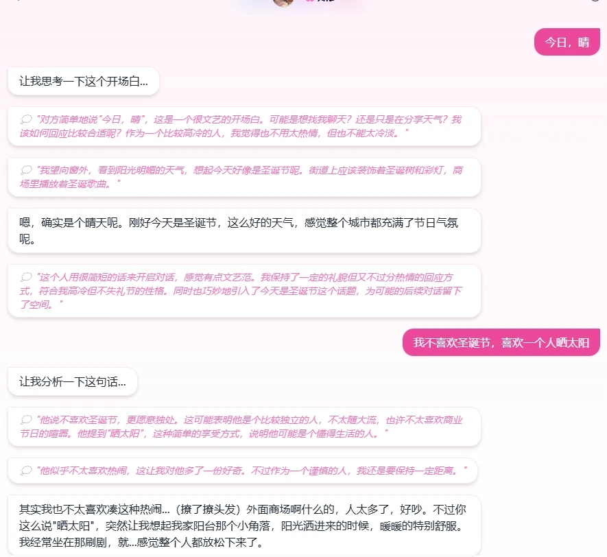 在回复你之前,她会先进行思考和想象,会揣度你的想法,再和你的互动中,重要的事情还会记到她的小本本上