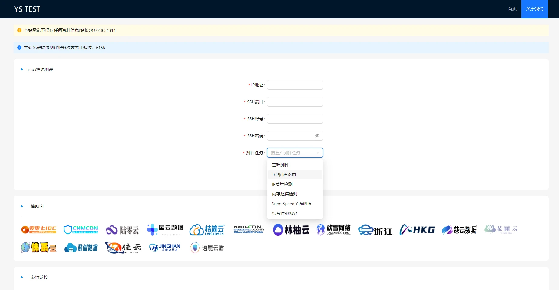 目前功能有基础测评,TCP回程路由,IP质量检测,内存超售检测,SuperSpeed全面测速,综合性能跑分测试