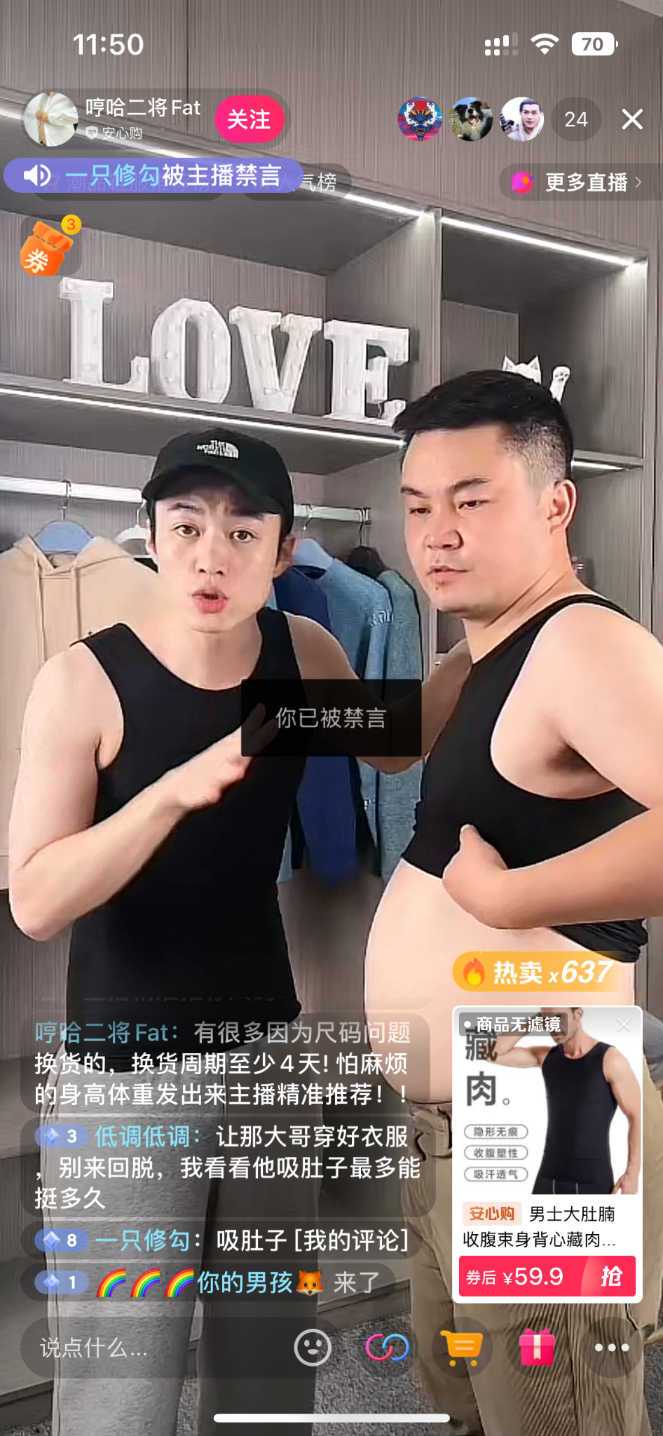 打开抖音就看见这个直播,卖瘦肚子的,穿上后明显看他吸肚子,评论一下被禁言