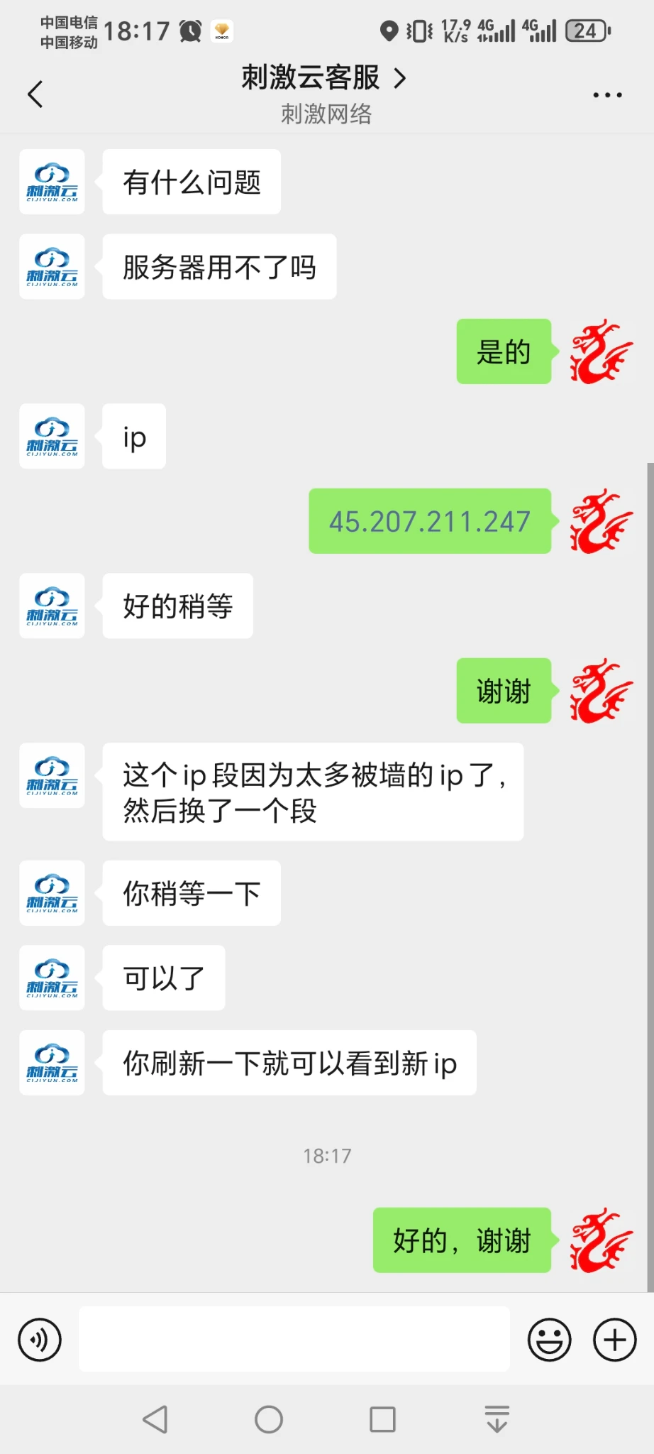 这几天没有看网站,今天一看打不开了,宝塔后台也打不开了,打开刺激云还能打开,而且登录正常。联系刺激云qq客服(这个qq为论坛里转换刺激云的那位),结果没反应。无法了,刺激云首页有个联系我的,点了一下,居然跳转到了微信的客服号,抱着试试看的心里联系了下,居然有回复了。最后帮我换了ip,还好没跑路。要不然我有几天的数据丢了怪可惜的。