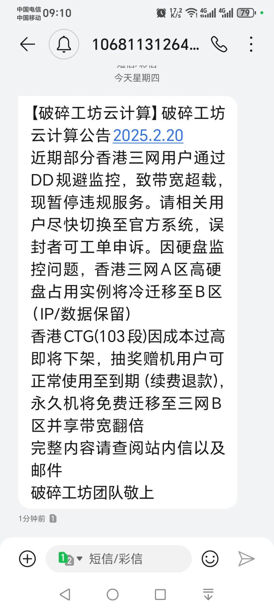 近期部分香港三网用户通过DD规避监控,致带宽超载,现暂停违规服务。请相关用户尽快切换至官方系统,误封者可工单申诉。因硬盘监控问题,香港三网A区高硬盘占用实例将冷迁移至B区(IP/数据保留)
