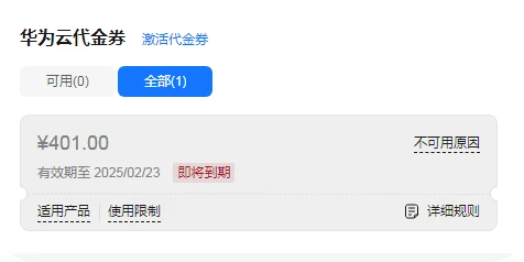 | 不可用于特价套餐,不可用于云商店,不可用于管理检测与响应、隐私保护通话、视频监控、设备管理、CloudPond、iTA流量、IoT云通信、媒体处理、联络中心、语音通话、通信平台云、企业名片、域名注册服务、储值卡、消息&短信、语音外呼、视频点播、云证书管理服务、电信业务云CloudLink、直播加速、线下产品、视频直播、全球SIM联接,不可用于华为云硬件类商品 |