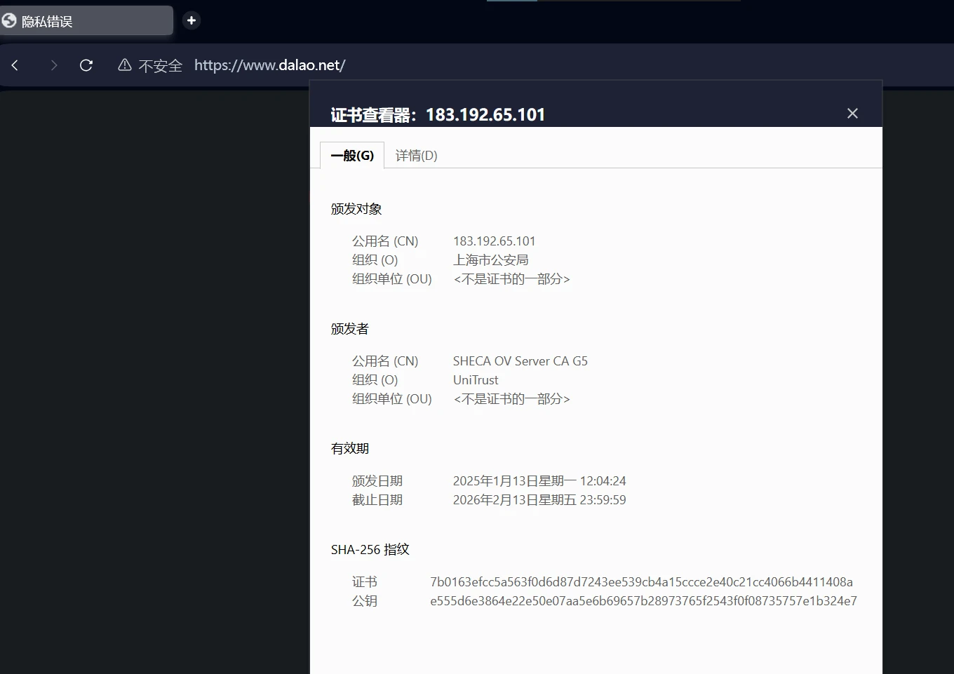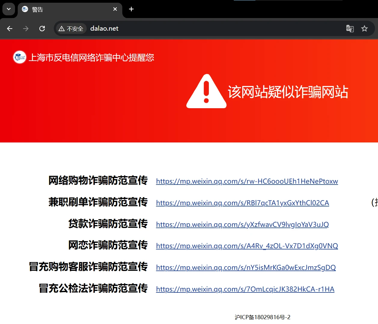 今天刷了一下路由器,把代理关了,结果dalao.net直接变反诈提示了?