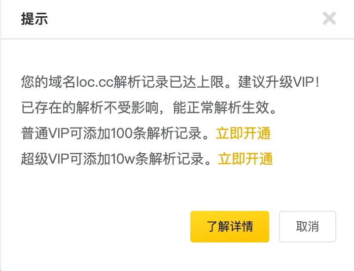 dns.com 现在应该是限制了普通用户只能10条解析,开通会员才能增加解析数量,而且此会员并非解析会员,解析会员另算,这也促使我不再使用 dns.com。