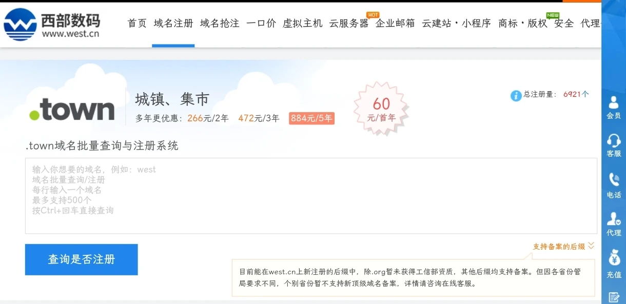 发现一个奇怪的地方,town后缀目前是没有备案的,但是西部数码居然是可以注册的,按照西部官方说明,西部可以注册的后缀,除了org之外,其他的都可以备案,但问题来了,这个后缀不能备案啊,西部为啥能注册