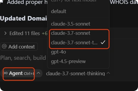 使用cursor 聊天的时候,一定要选上 agent模式,并且模型要选 claude 3.7 sonnet 或者 claude 3.7 sonnet thinking
