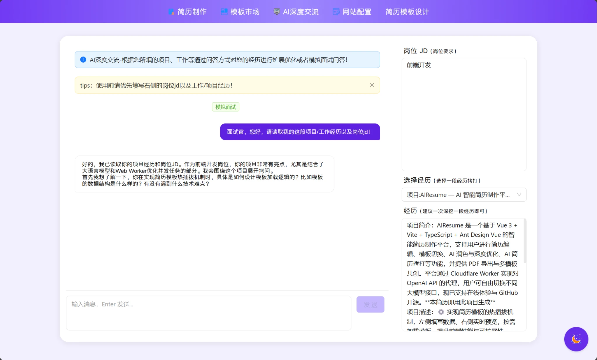 项目开源地址: https://github.com/weidong-repo/AIResume项目预览地址(pc 端访问):https://resume.404.pub