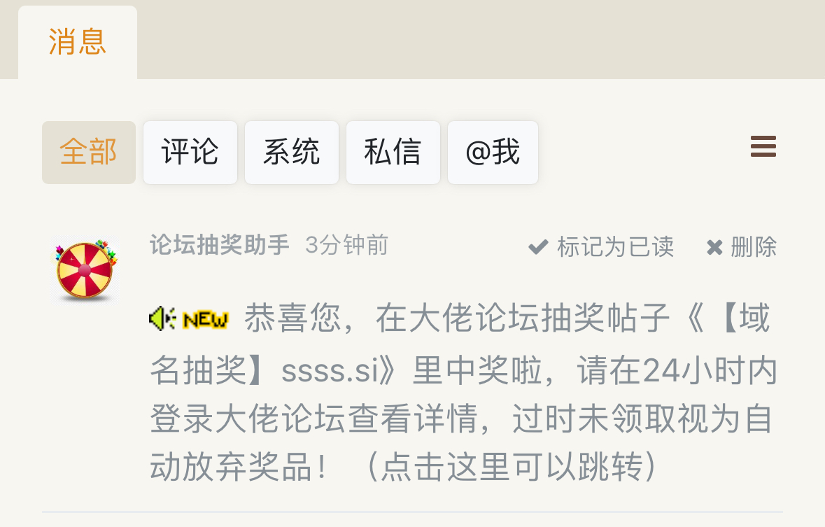 可惜我不玩那个注册商,不方便接收。晚一会大佬可能再重新发起抽奖,祝各位好运哦🍀
