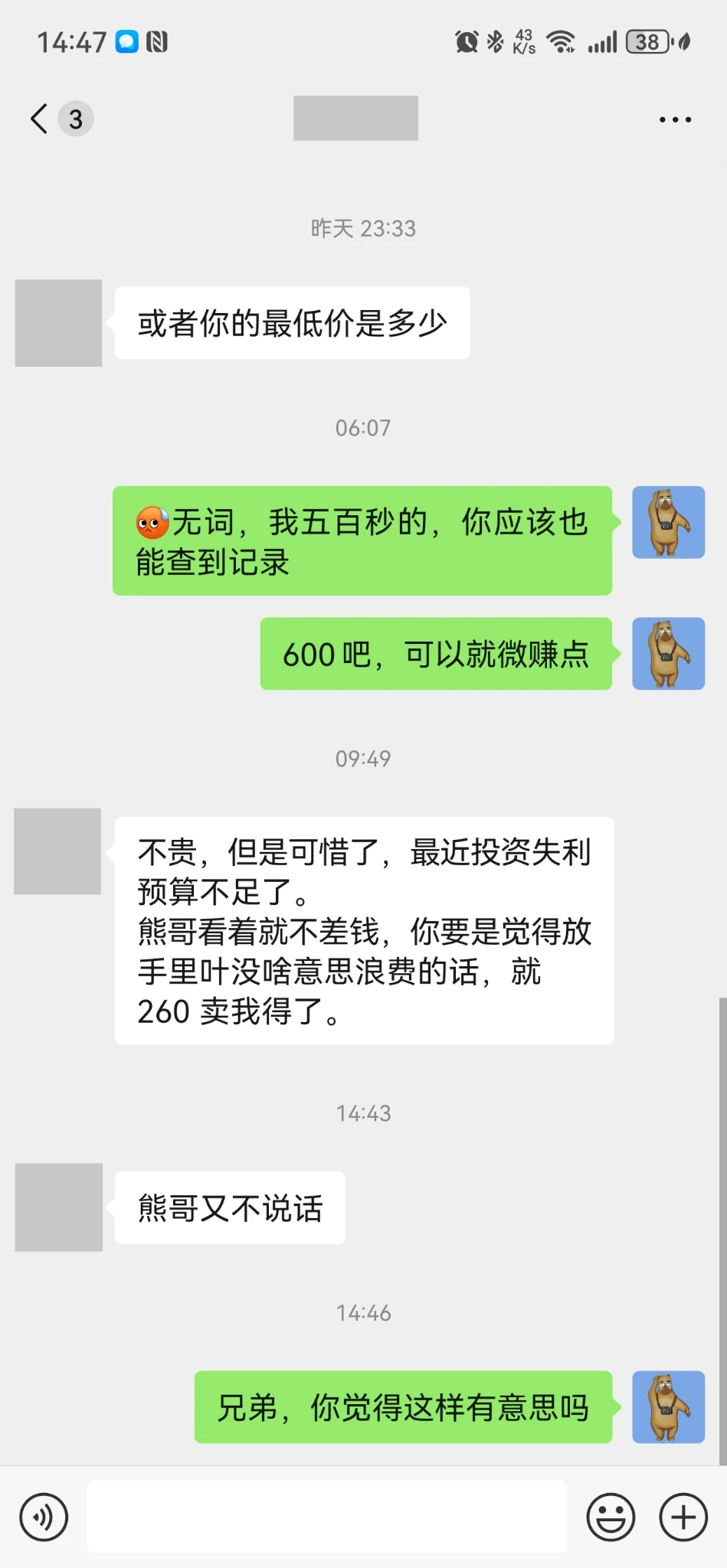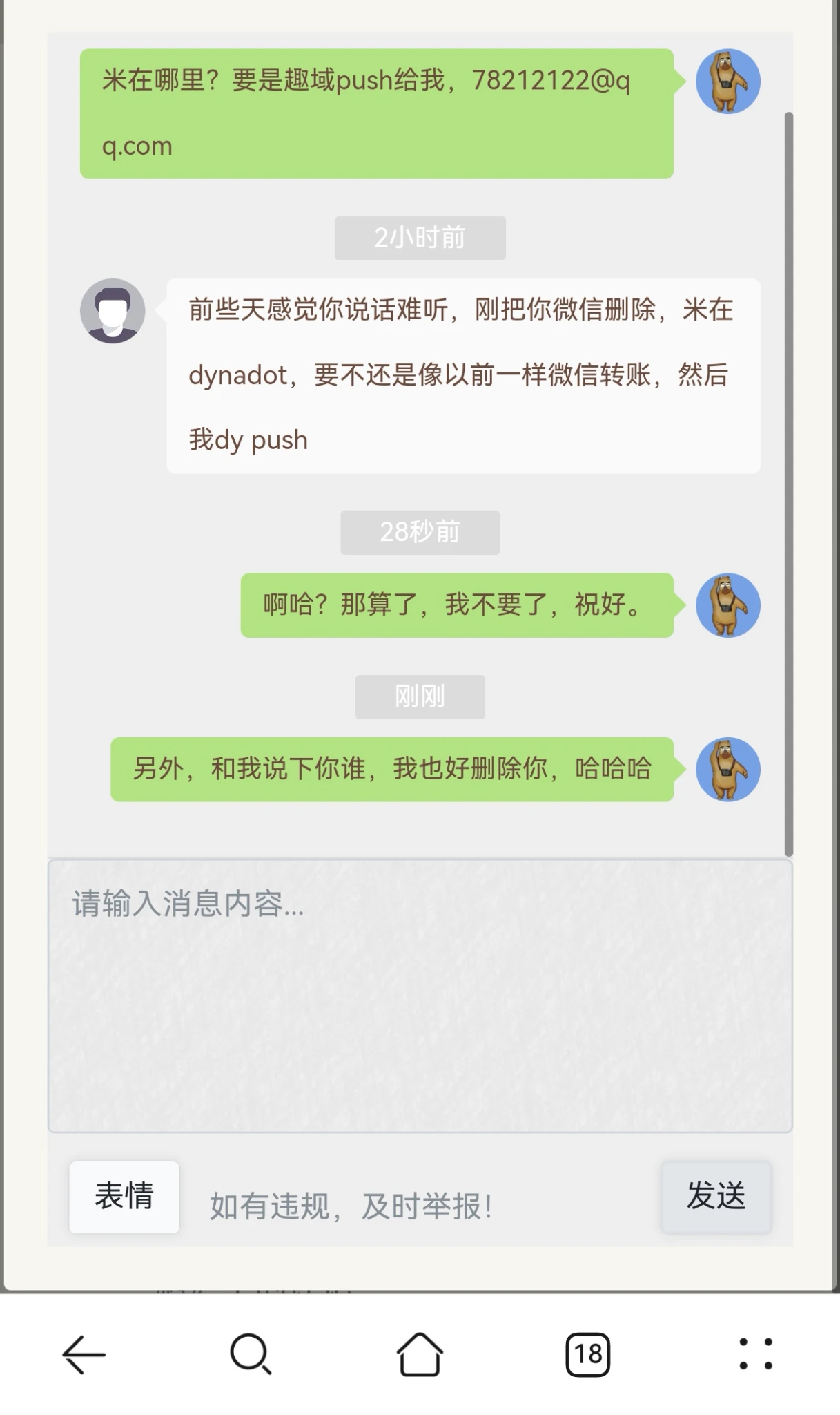 然后过了几个小时,他又发:熊哥,你又不说话了,我早就表明了我的态度,这人不识趣啊,我就回他,兄弟,你有意思吗?然后我截图打码发到了《国别域名交流群》里,好像是这个也就是300人的那个群。当时还有群友还说别打码,我说还是要保护下隐私,然后我就响应群友的说法删掉他了。