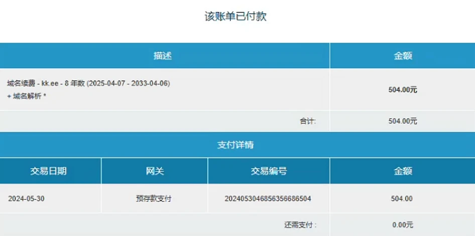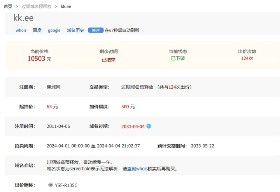 竞拍价10503+504 续费8年,合计11,507