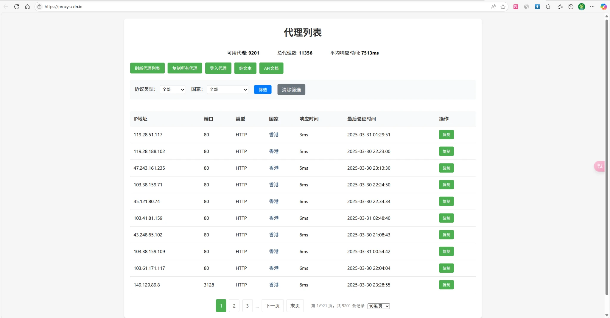 写爬虫被因相同的IP被频繁拉黑需要不断地切换多个代理来进行爬取,奈何网上搜出来全是收费或者不提供API获取代理等各种体验不佳的代理,这是一个完全免费纯净的公共代理,24小时不间断爬取各个地方的公共代理,并支持每个人自行在本项目中导入代理,系统会自动逐步验证每个代理的可用性并导入至可用代理中,所有代理都会在每几个小时验证可用性并更新状态,且提供API可自行通过API来获取代理,还支持纯文本每行一个代理可直接获取到所有的代理~