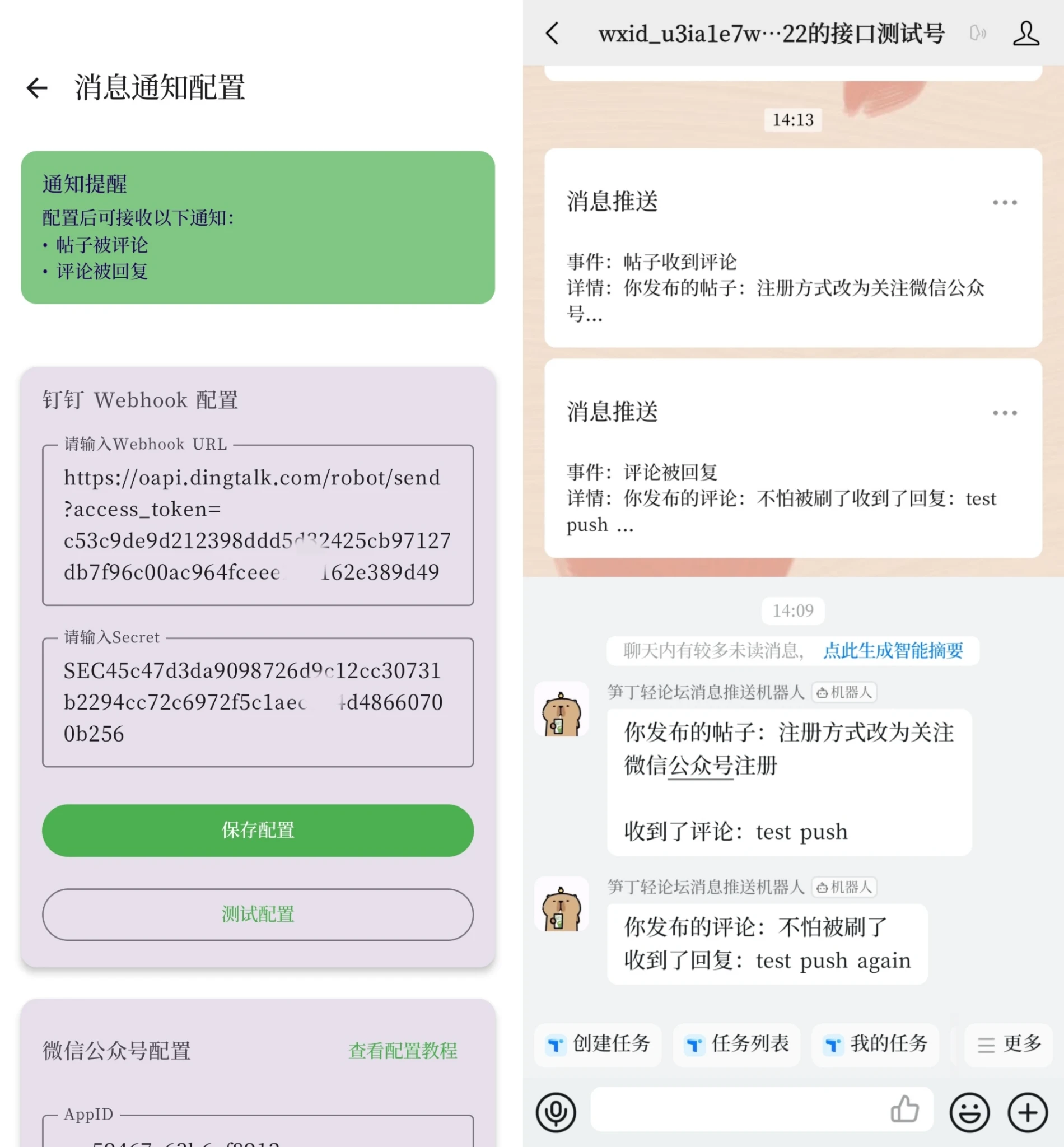 然后用户自定义开启接收事件,例如帖子被评论,评论被回复,收到私信,接收论坛所有新帖,接收指定用户新帖等事件