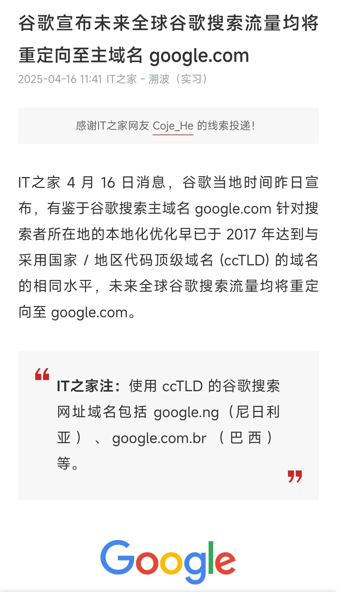 谷歌停用国别域名!所以说,能com!就com。别将就!