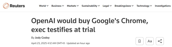 今天凌晨4点,路透社消息,OpenAI一位高管在谷歌垄断案庭审中作证,将收购其浏览器Chrome。