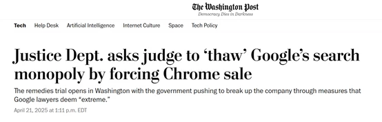 今天凌晨1点左右,华盛顿邮报最早报道了谷歌被起诉的消息。美国司法部要求法官通过强制销售Chrome来打破谷歌的搜索垄断地位。