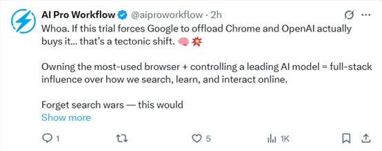 哇哦。如果这场庭审迫使谷歌剥离 Chrome,而 OpenAI 真的将其收购那将是一场颠覆性的行业地震。坐拥全球使用最广泛的浏览器,同时掌控领先的 AI 模型 —— 这意味着OpenAI 将对我们在线搜索、学习和互动的方式形成全栈式影响力。